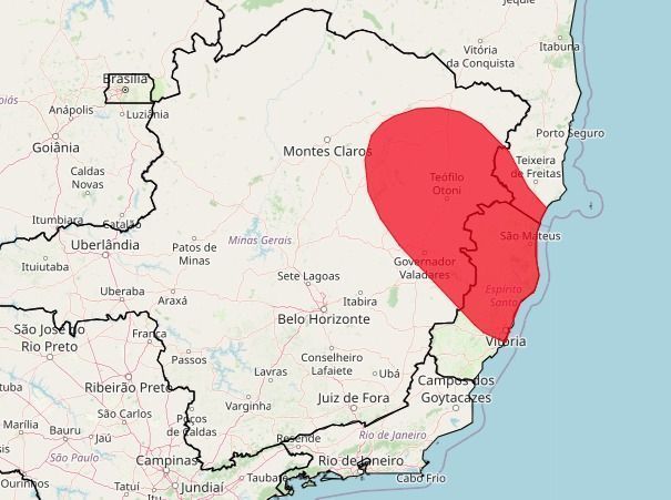 A marca vermelha mostra a área de alerta do Inmet, que engloba partes do nordeste de Minas e mais da metade do estado do Espírito Santo. Veja na imagem acima.