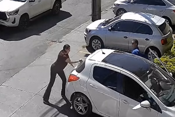 A mulher continua batendo no vidro do carro