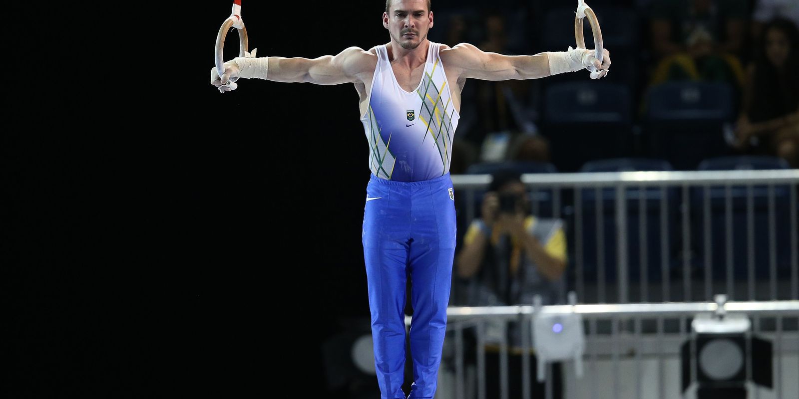 Ginasta Arthur Zanetti (D) é prata nas argolas em final vencida pelo grego Eleftherios Petrounias (C), com o russo Denis Abliazin (E) em terceiro – Fernando Frazão/Agência Brasil