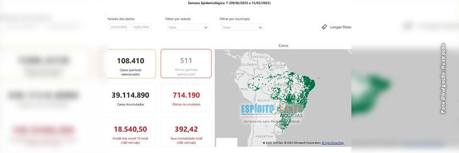 O Brasil registrou 108.410 novos casos de Covid-19 em 2025, considerando o período de 1° de janeiro a 15 de fevereiro. O intervalo corresponde às sete primeiras semanas epidemiológicas (SE) deste ano e representa uma alta de 52% ante os 71.479 registrados nas últimas sete semanas epidemiológicas de 2024, que engloba o período entre os dias 8 de novembro e 28 de dezembro. Os dados são do painel do Painel da Covid-19 no Brasil, do Ministério da Saúde.