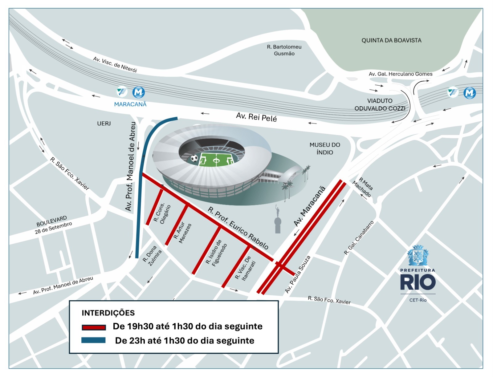 A Companhia de Engenharia de Tráfego do Rio de Janeiro (CET-Rio) realizará operação de trânsito na quarta-feira (01/04) para o jogo entre Fluminense e Corinthians pelo Campeonato Brasileiro, que acontecerá às 21h30, no estádio do Maracanã. As interdições ao trânsito de veículos na região começam a partir das 19h30 e vão até 1h30 de quinta-feira (02/04). Além dos locais regulamentados com proibição de estacionamento, outras vias também estarão restritas ao estacionamento a partir das 10h.